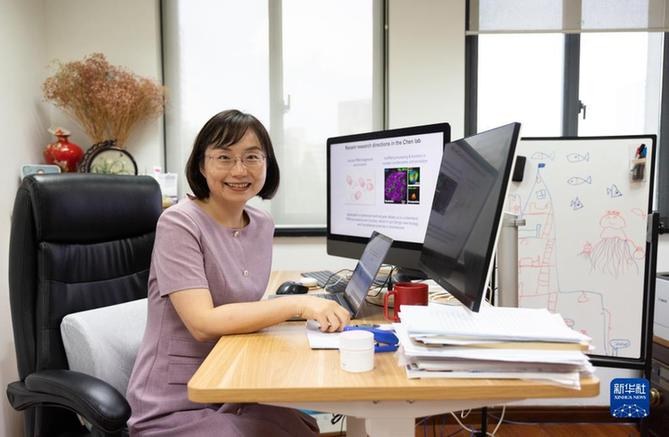 陈玲玲在中国科学院分子细胞科学卓越创新中心办公室留影,右侧是她女儿的画作(2022年8月11日摄)。新华社记者 金立旺摄
