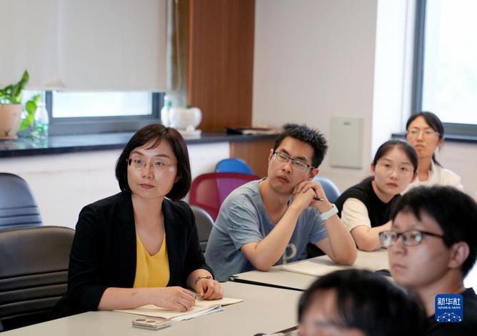陈玲玲(左一)在中国科学院分子细胞科学卓越创新中心和学生们开会(2022年9月13日摄)。新华社记者 刘颖 摄