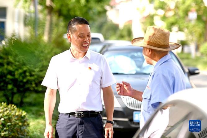 在浙江省宁波市奉化区萧王庙街道滕头村,傅平均(左)与一名老人交谈(9月16日摄)。新华社记者 黄宗治 摄