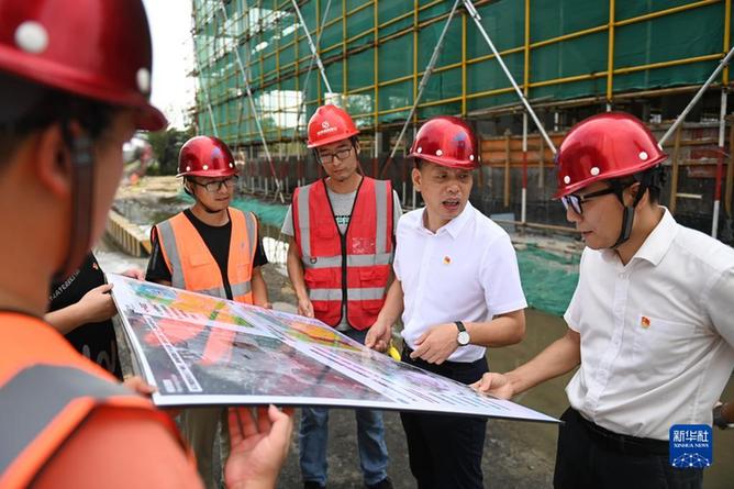 在浙江省宁波市奉化区萧王庙街道滕头村,傅平均(右二)在村党群服务中心大楼建设工地察看施工进展(9月16日摄)。新华社记者黄宗治 摄