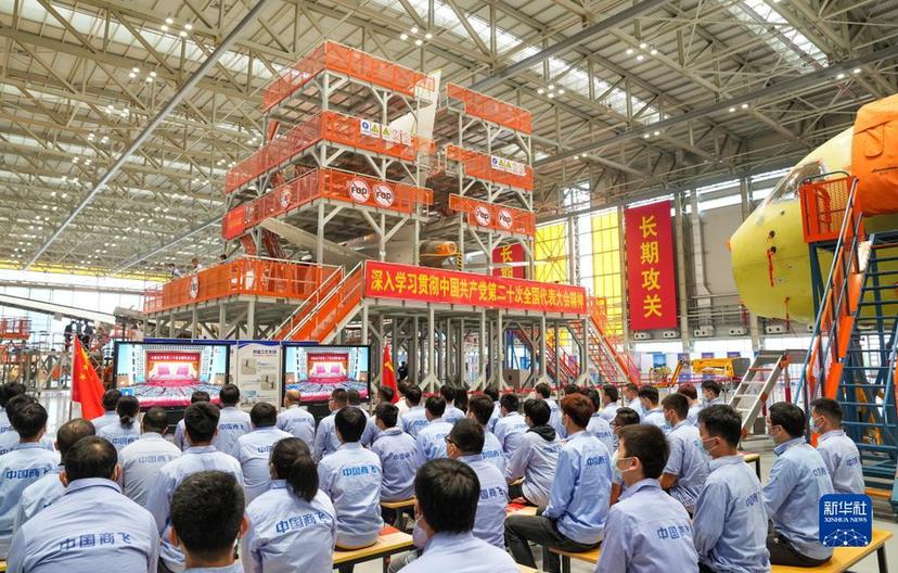 10月16日,在中国商飞上海飞机制造有限公司总装车间,员工们在收看中国共产党第二十次全国代表大会开幕会。新华社记者 丁汀摄