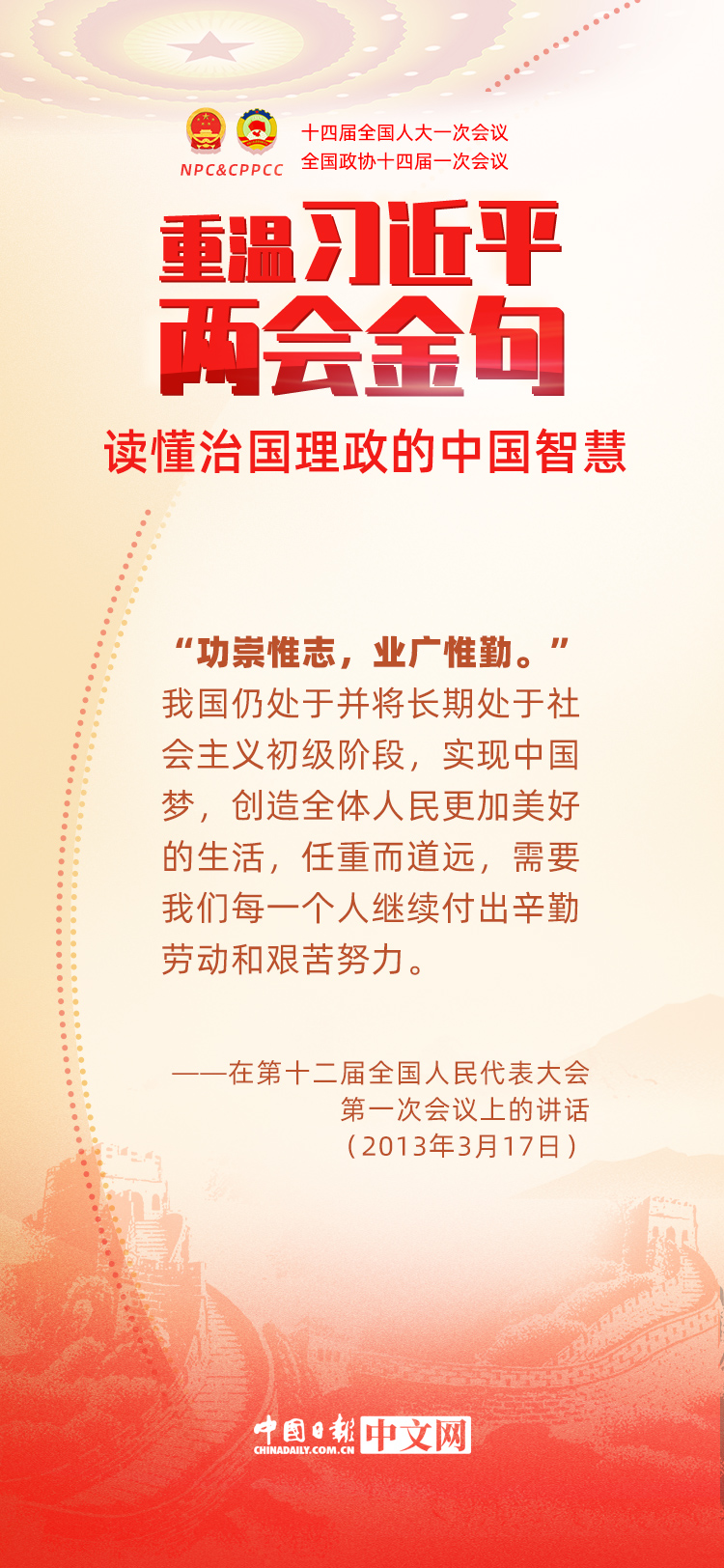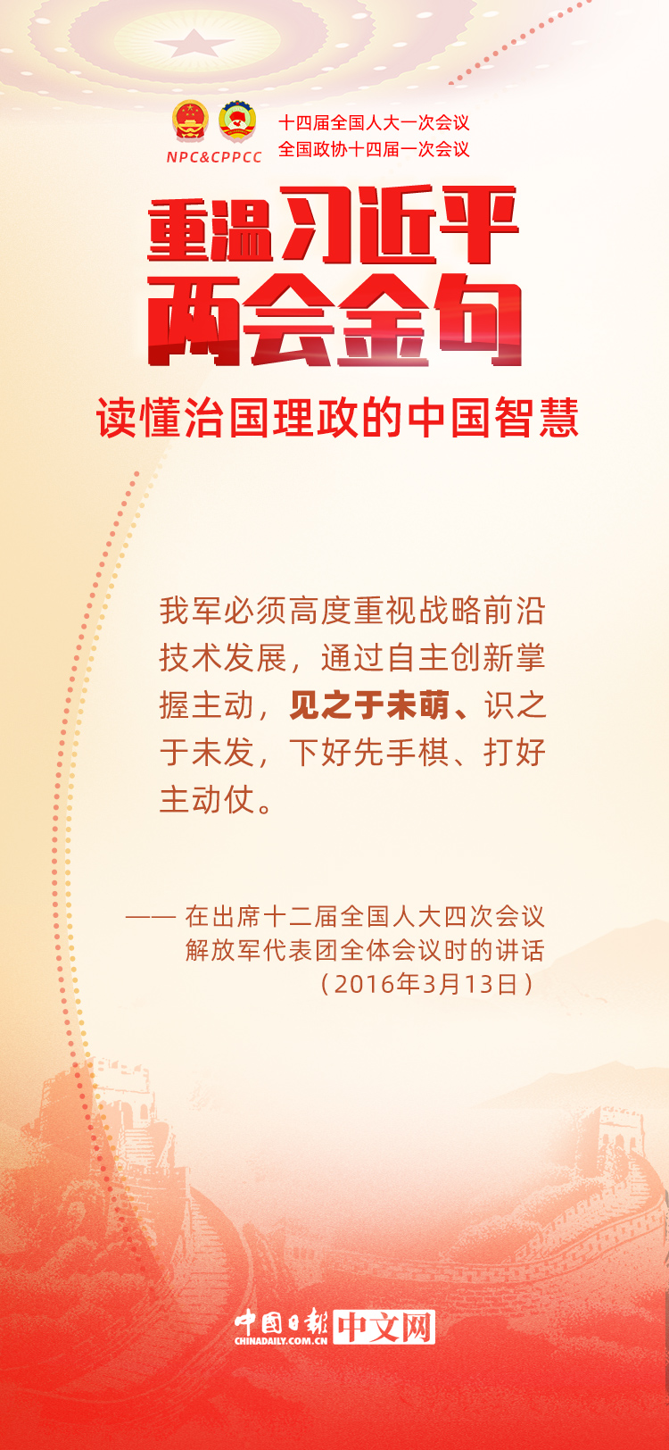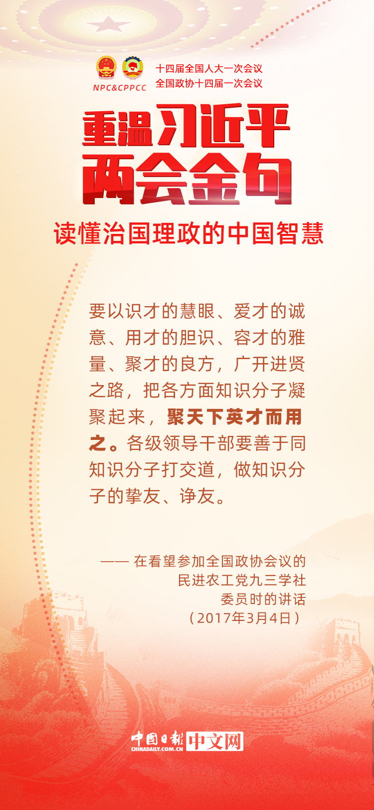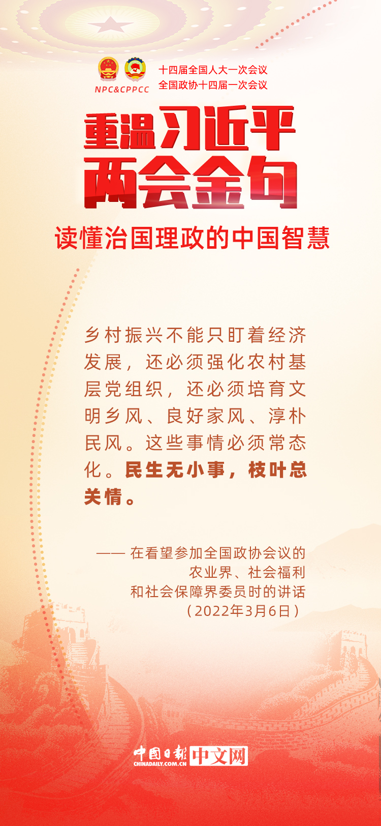 党的十八大以来,每年两会期间,习近平总书记都要与代表委员共商国是。十年来,在一系列重要论述中,习近平总书记使用诗词、古语等典故,把中华优秀传统文化融入治国理政的理论和实践中。