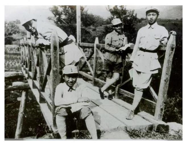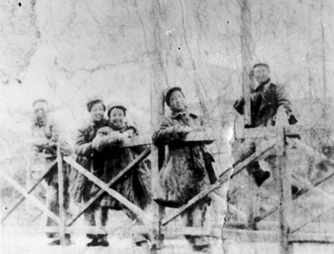 新四军战士在桥上合影。(叶挺摄)