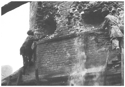 图为八路军战士在爆破新矿大烟囱。