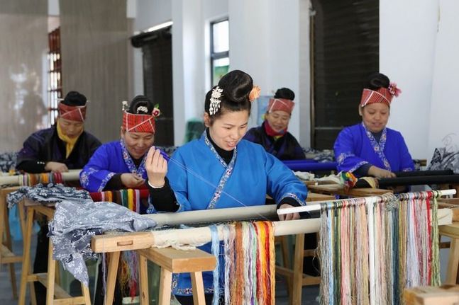 2024年12月16日,在贵州省黔东南苗族侗族自治州施秉县城关镇易地扶贫搬迁南官营社区一家苗绣企业生产车间,入职的社区居民在赶制订单产品。新华社发(邰胜智摄)
