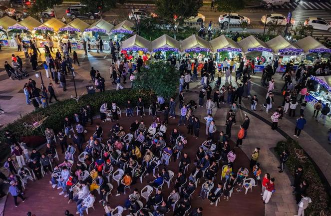 11月7日,依托当晚在西施篮球中心举办的系列演唱会,“陶你所需·朱市云集”社区共富市集吸引了大批市民游客(无人机照片)。新华社记者徐昱 摄