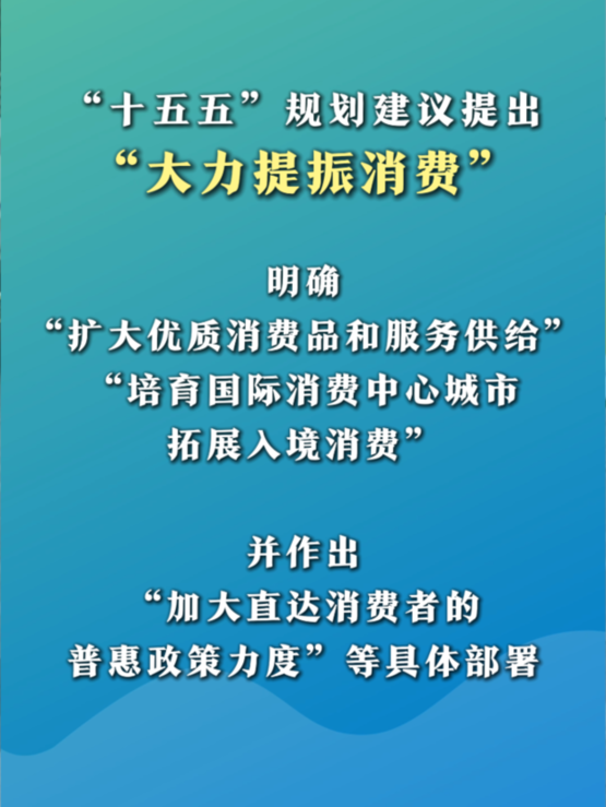 “十五五”规划建议提出“大力提振消费”,明确“扩大优质消费品和服务供给”“培育国际消费中心城市,拓展入境消费”,并作出“加大直达消费者的普惠政策力度”等具体部署。中国现有14亿多人口,未来十多年中等收入群体将超过8亿人,市场潜力巨大。