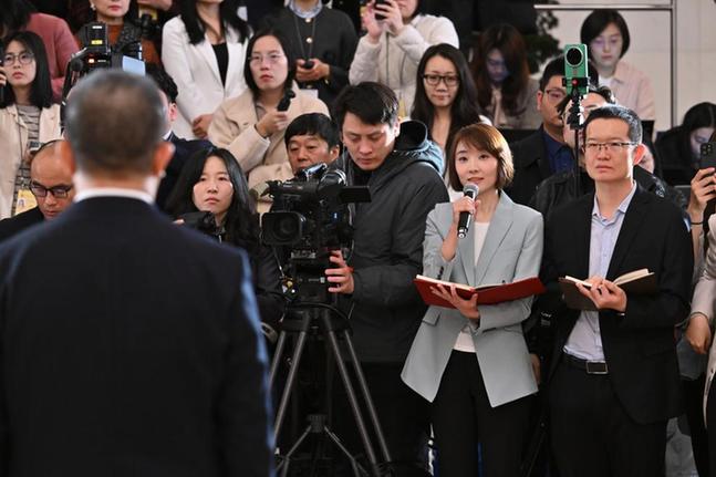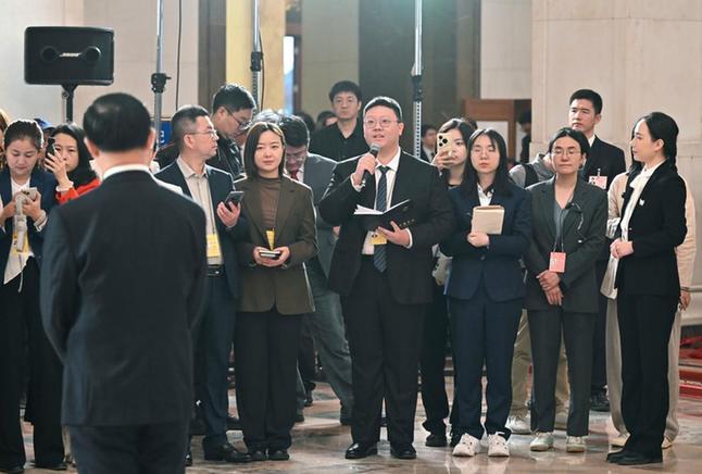 3月9日,第十四届全国人民代表大会第四次会议第二场“代表通道”集中采访活动在北京人民大会堂举行。这是记者在现场提问。